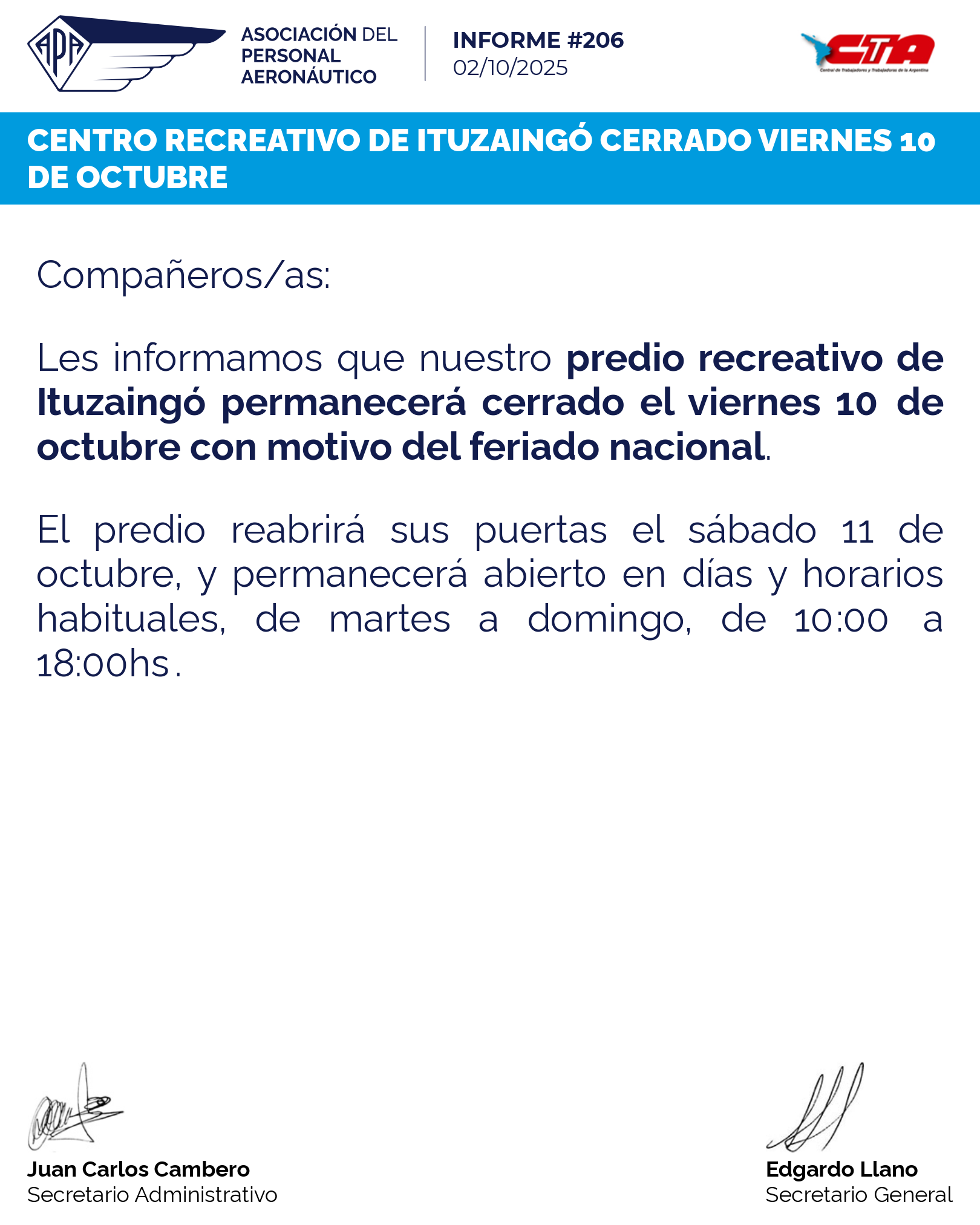 Les informamos que nuestro predio recreativo de Ituzaingó permanecerá cerrado el viernes 10 de octubre con motivo del feriado nacional.