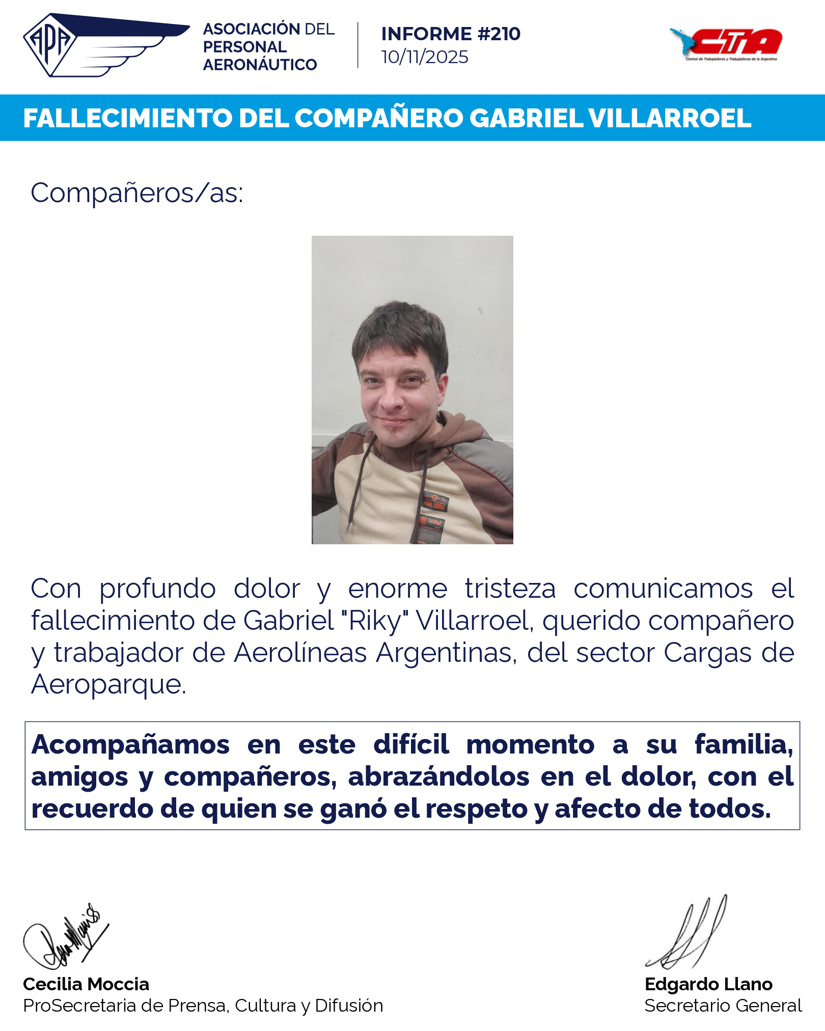 Con profundo dolor y enorme tristeza comunicamos el fallecimiento de Gabriel "Riky" Villarroel, querido compañero y trabajador de Aerolíneas Argentinas, del sector Cargas de Aeroparque.
