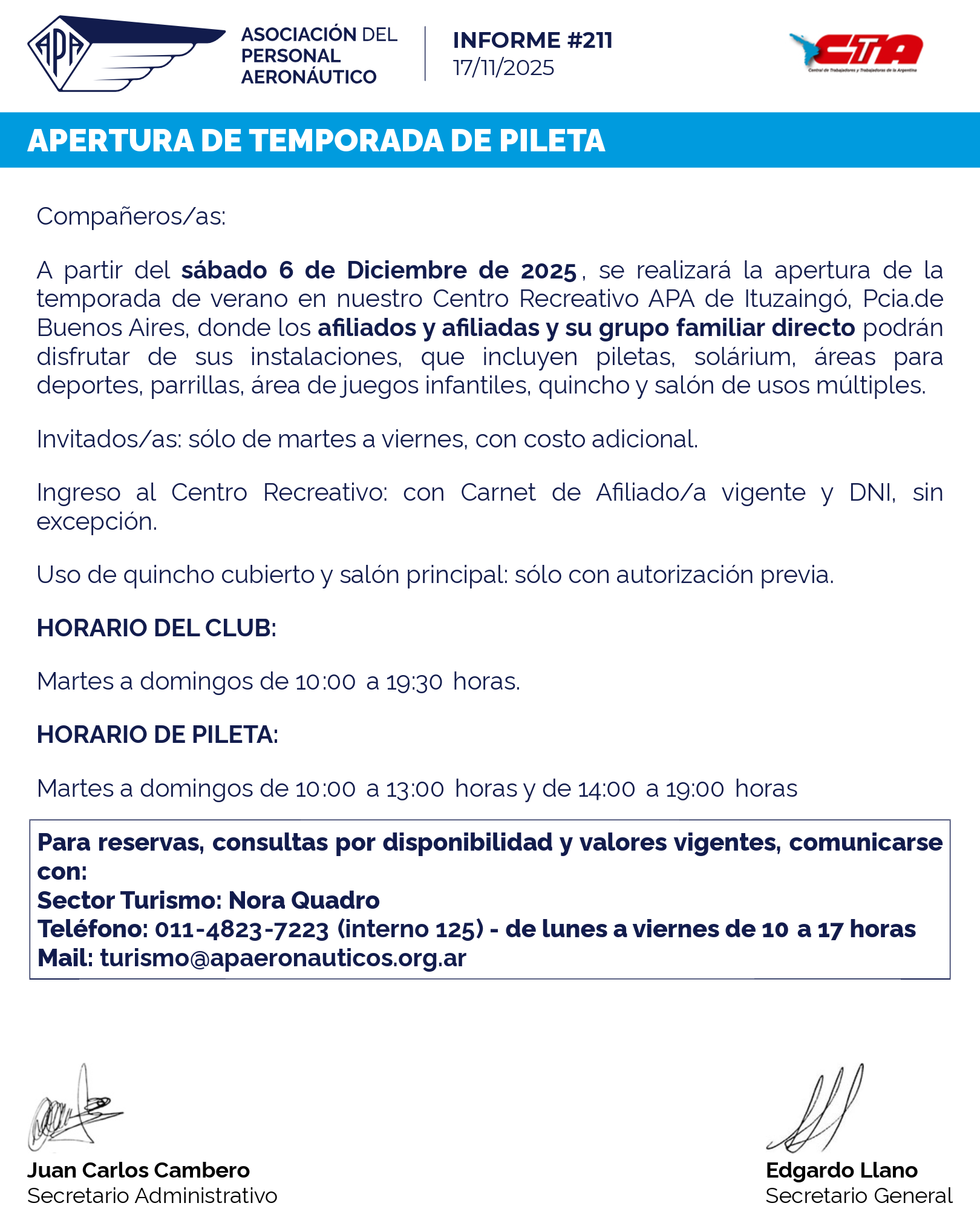 A partir del sábado 6 de Diciembre de 2025, se realizará la apertura de la temporada de verano en nuestro Centro Recreativo APA de Ituzaingó, Pcia.de Buenos Aires, donde los afiliados y afiliadas y su grupo familiar directo podrán disfrutar de sus instalaciones, que incluyen piletas, solárium, áreas para deportes, parrillas, área de juegos infantiles, quincho y salón de usos múltiples.