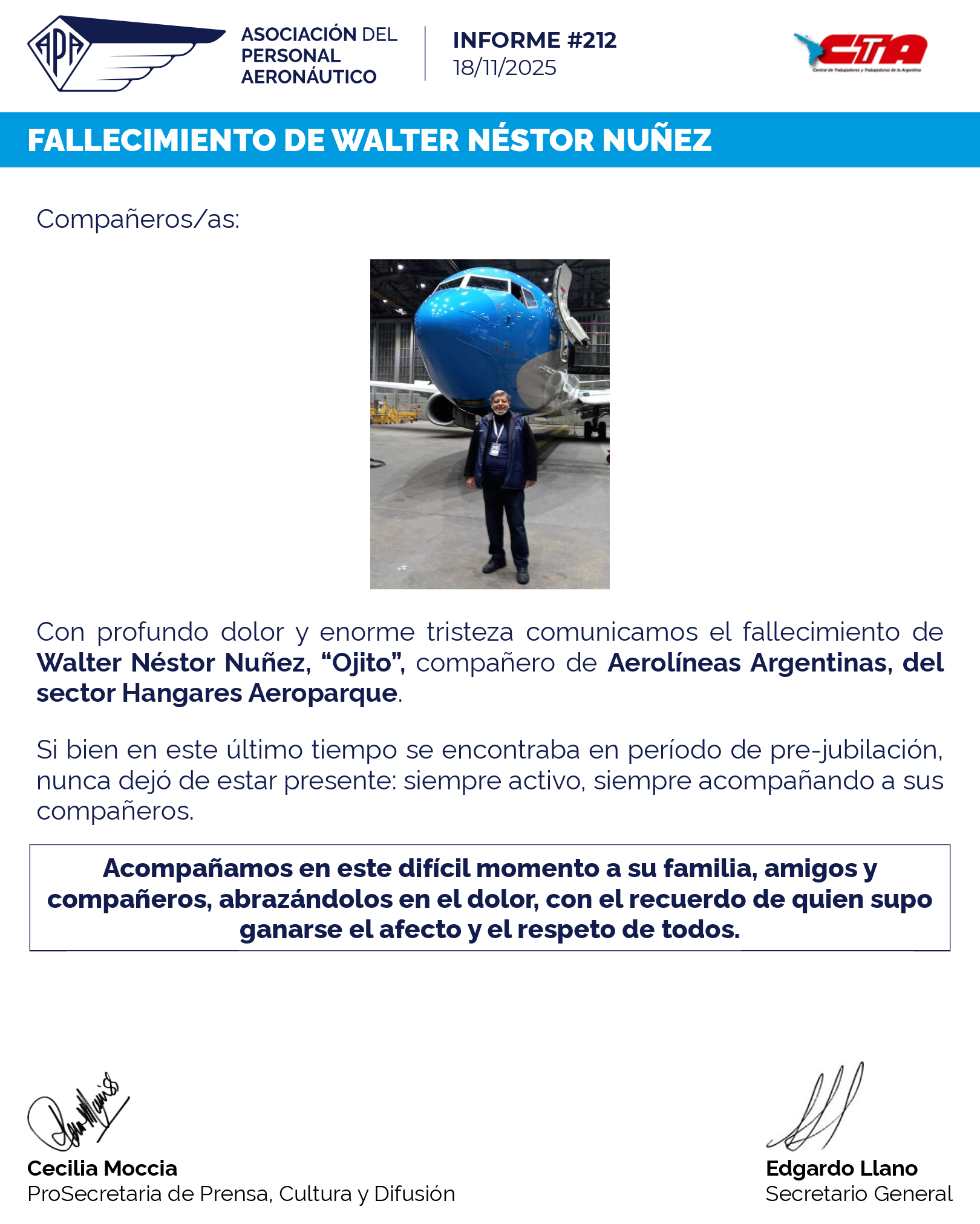 Con profundo dolor y enorme tristeza comunicamos el fallecimiento de Walter Néstor Nuñez, “Ojito”, compañero de Aerolíneas Argentinas, del sector Hangares Aeroparque.