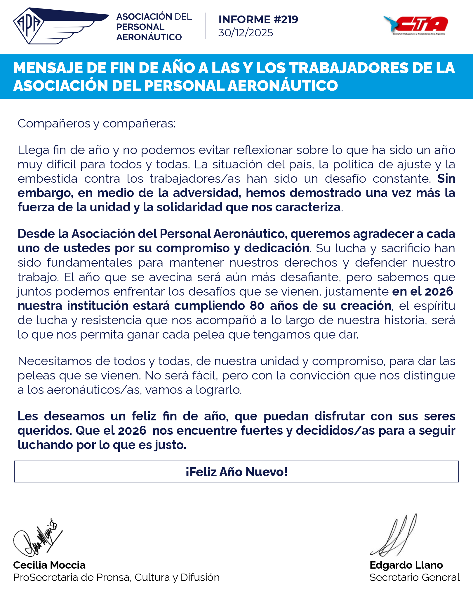 Desde la Asociación del Personal Aeronáutico, queremos agradecer a cada uno de ustedes por su compromiso y dedicación. Su lucha y sacrificio han sido fundamentales para mantener nuestros derechos y defender nuestro trabajo. El año que se avecina será aún más desafiante, pero sabemos que juntos podemos enfrentar los desafíos que se vienen, justamente en el 2026 nuestra institución estará cumpliendo 80 años de su creación, el espíritu de lucha y resistencia que nos acompañó a lo largo de nuestra historia, será lo que nos permita ganar cada pelea que tengamos que dar.