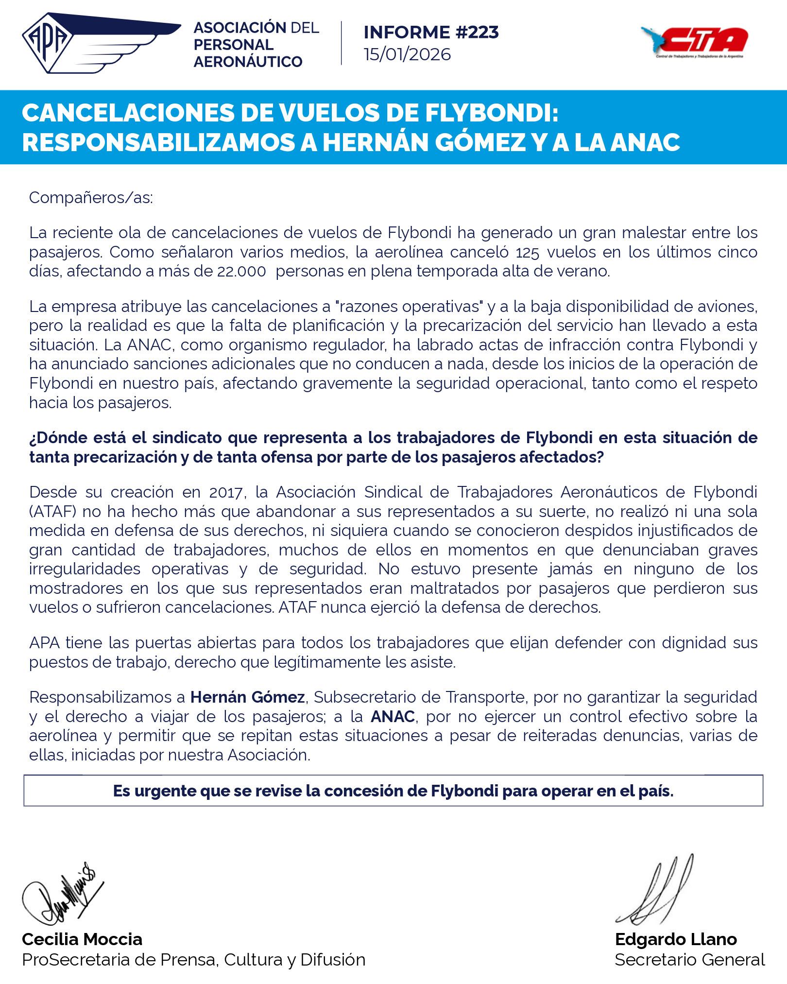 Responsabilizamos a Hernán Gómez, Subsecretario de Transporte, por no garantizar la seguridad y el derecho a viajar de los pasajeros; a la ANAC, por no ejercer un control efectivo sobre la aerolínea y permitir que se repitan estas situaciones a pesar de reiteradas denuncias, varias de ellas, iniciadas por nuestra Asociación.