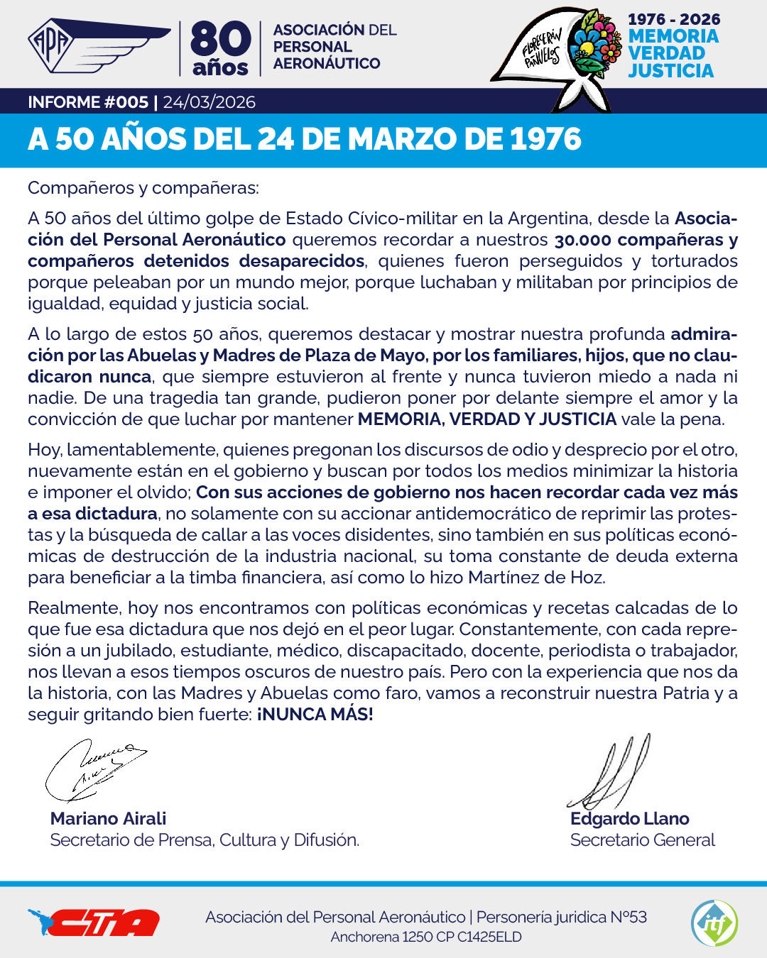 A 50 años del último golpe de Estado Cívico-militar en la Argentina, desde la Asociación del Personal Aeronáutico queremos recordar a nuestros 30.000 compañeras y compañeros detenidos desaparecidos, quienes fueron perseguidos y torturados porque peleaban por un mundo mejor, porque luchaban y militaban por principios de igualdad, equidad y justicia social.