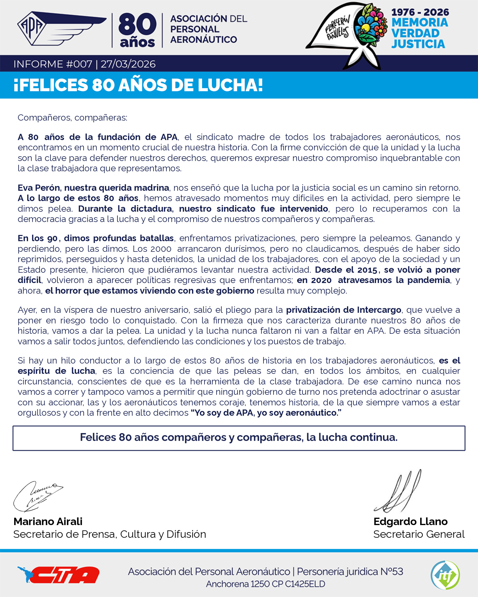 Ayer, en la víspera de nuestro aniversario, salió el pliego para la privatización de Intercargo, que vuelve a poner en riesgo todo lo conquistado. Con la firmeza que nos caracteriza durante nuestros 80 años de historia, vamos a dar la pelea. La unidad y la lucha nunca faltaron ni van a faltar en APA. De esta situación vamos a salir todos juntos, defendiendo las condiciones y los puestos de trabajo.
