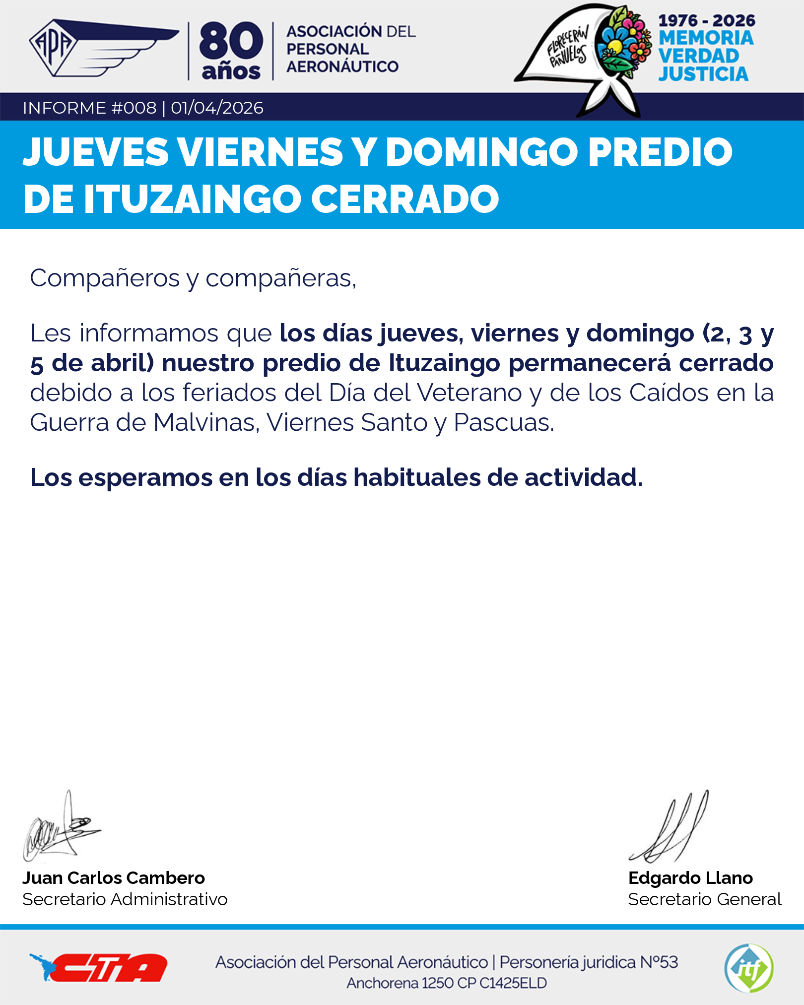Les informamos que los días jueves, viernes y domingo (2, 3 y 5 de abril) nuestro predio de Ituzaingo permanecerá cerrado debido a los feriados del Día del Veterano y de los Caídos en la Guerra de Malvinas, Viernes Santo y Pascuas.