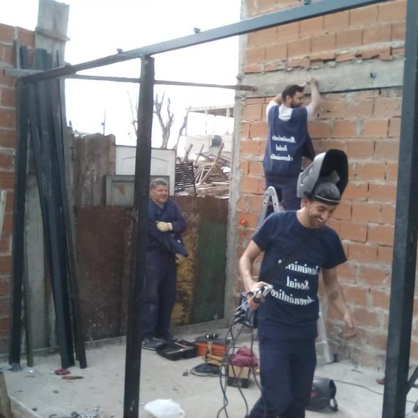 Mirás a un costado y un compañero levanta tierra con una pala, mirás al otro costado y otro grupo de compañeros coloca un tejido perimetral.Mientras te alcanzan un mate calentito, se escuchan las carretillas recorrer los pasillos del comedor y la moladora que corta los perfiles para armar la estructura donde reposarán las chapas cuando el techo esté completo.