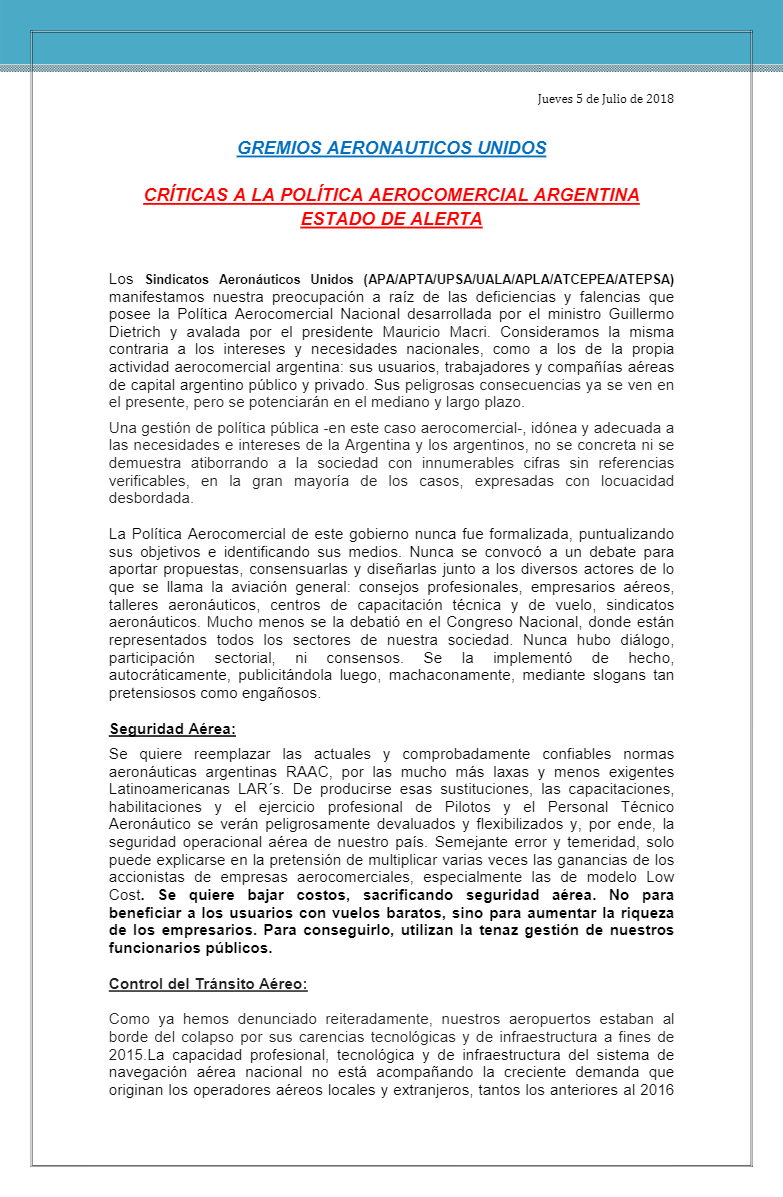 GREMIOS AERONÁUTICOS UNIDOS CRÍTICAS A LA POLÍTICA AEROCOMERCIAL ARGENTINA – ESTADO DE ALERT