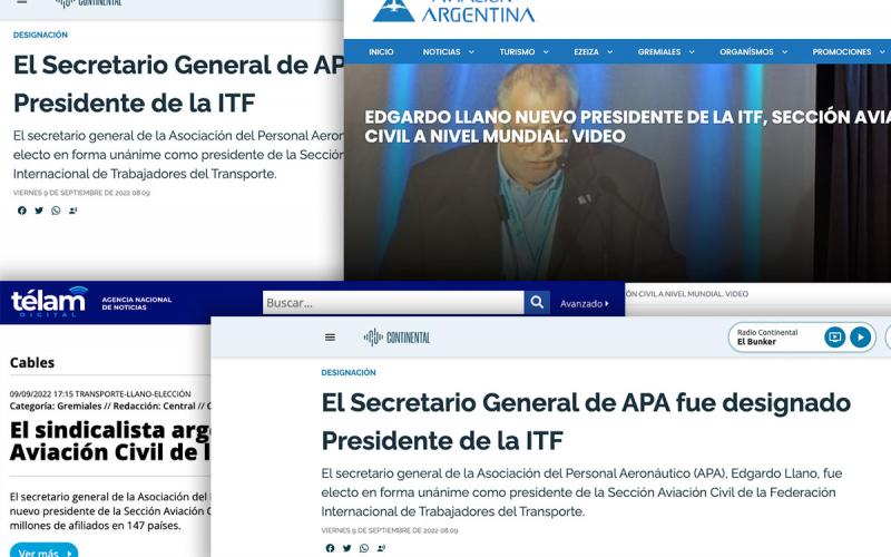 En una decisión histórica para nuestra organización gremial, y un reconocimiento a la trayectoria de su Secretario General, el compañero Edgardo Llano ha sido elegido por unanimidad como Presidente a nivel mundial de la Sección de Aviación Civil de la Federación Internacional de Trabajadores del Transporte (ITF), junto a los Vicepresidentes Oliver Richardson (UNITE, Gran Bretaña) y Sara Nelson (Estados Unidos) y al Secretario de la Sección, Gabriel Mocho Rodriguez.